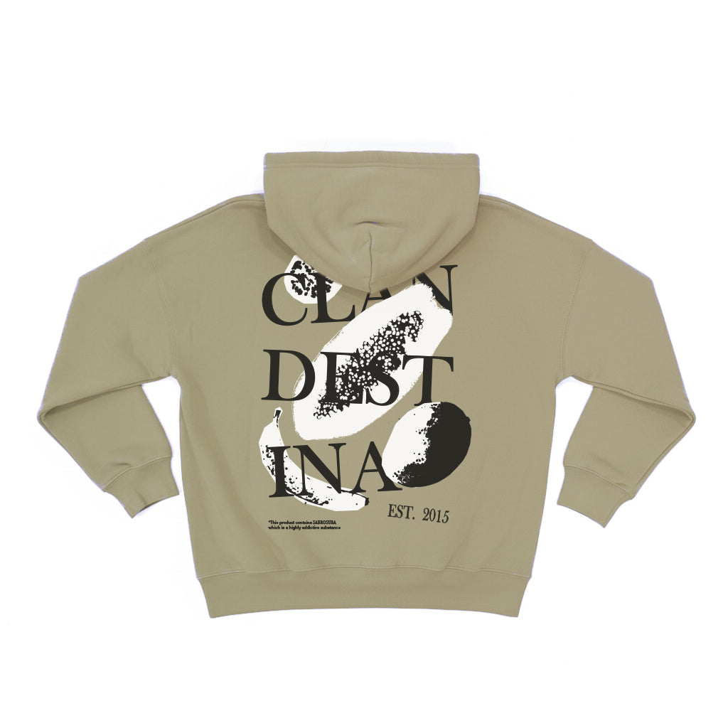 The oversized back artwork mixes the CLANDESTINA logo with expressive shapes inspired by the word sabrosura—a Cuban way of describing flavor, rhythm, and irresistible energy. The neutral sand color keeps it versatile while the graphic adds character.